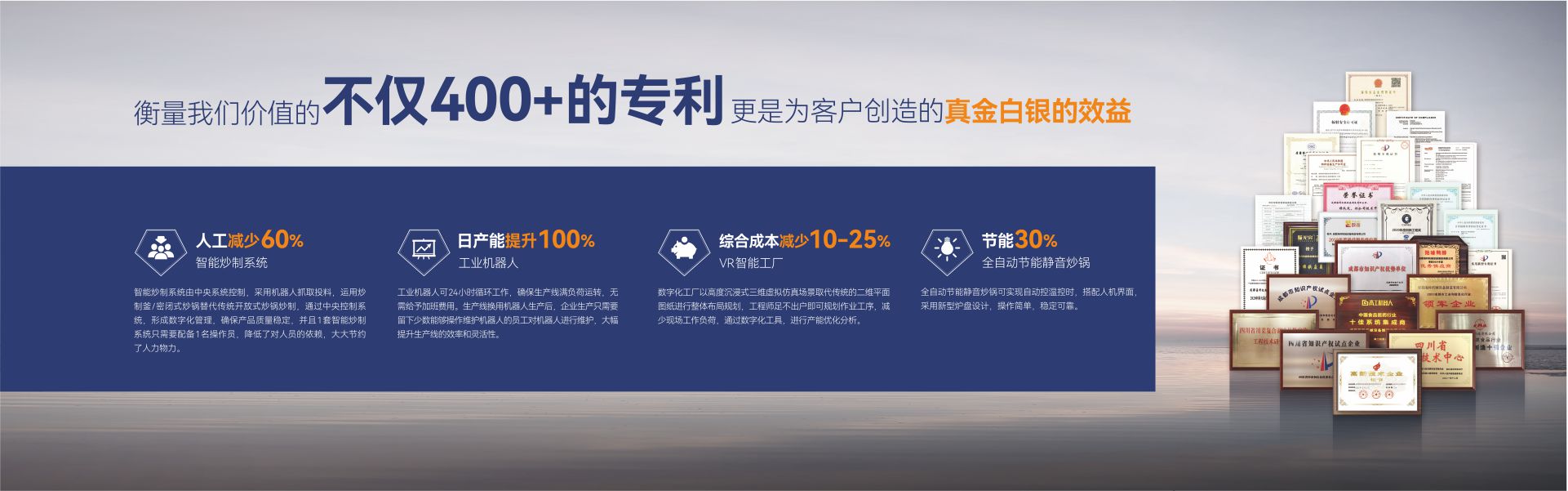 成都??茩C械設備制造有限公司(簡稱:成都??疲┦且患壹邪l、生產、銷售、服務為一體,專注為中國傳統食品行業提供自動化、智能化、數字化、智慧工廠整體解決方案的國家級高新技術企業。公司擁有標準化辦公樓及現代化生產車間約42000m2,具有較強的綜合研制、設計開發、生產能力,具備嚴格的質量管理體系和完善的售后服務體系。公司業務范圍覆蓋:復合調味品智能生產線、中式醬鹵肉制品智能生產線、醬腌菜智能生產線、智慧餐廚、央廚預制菜調理智能生產線,與海底撈、天味、九毛九、聚慧、楊國福、絕味、雙匯、新希望、無窮、烏江、吉香居、仲景、李記樂寶、Tyson、益海嘉里、開小灶、老鄉雞等眾多知名企業合作。截止目前,成都??埔呀浿Τ?000+企業順利投產5000余條生產線,為客戶創造年產值超1000億元!